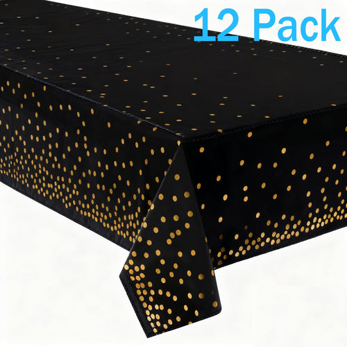 Plastic Table Cloth Disposable 12 Pack, 54 x 108 Inch, Black, Gold Dot, for Party Picnic Wedding